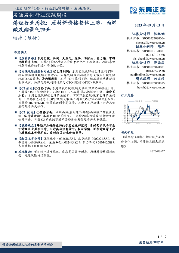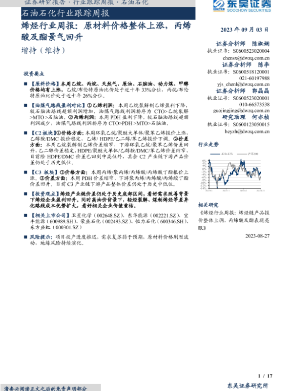 【东吴证券】【20230903】20230903-东吴证券-烯烃行业周报:原材料价格整体上涨,丙烯酸及酯景气回升-17页