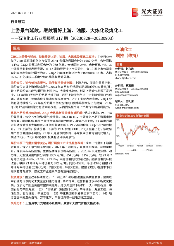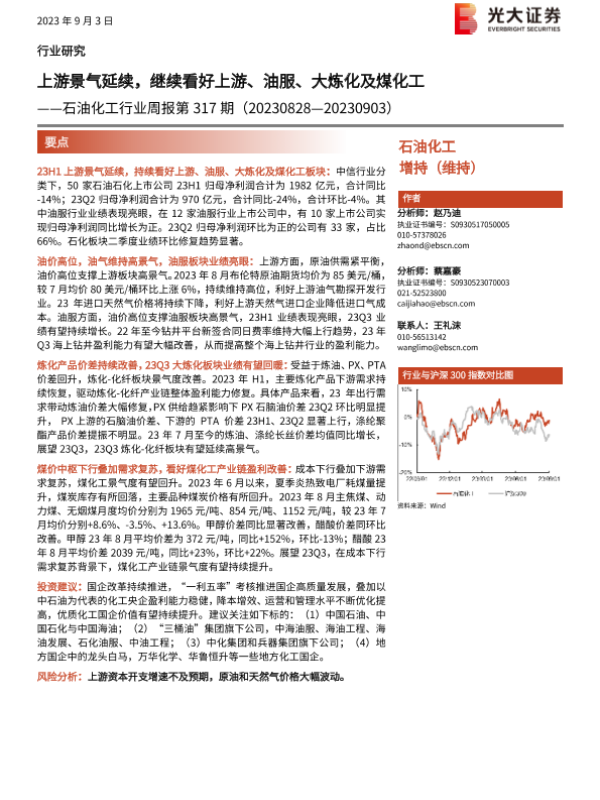 【光大证券】【20230903】石油化工行业周报第317期:上游景气延续,继续看好上游、油服、大炼化及煤化工-21页