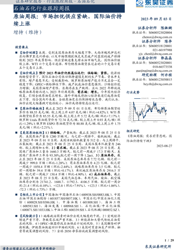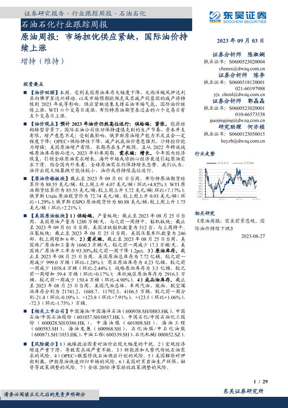 【东吴证券】【20230903】20230903-东吴证券-原油周报:市场担忧供应紧缺,国际油价持续上涨-29页