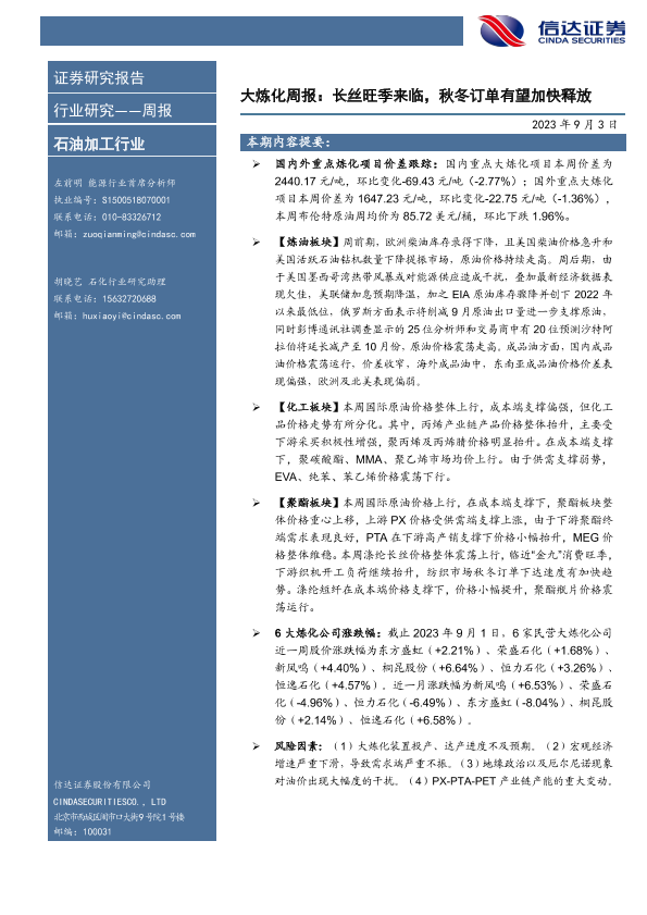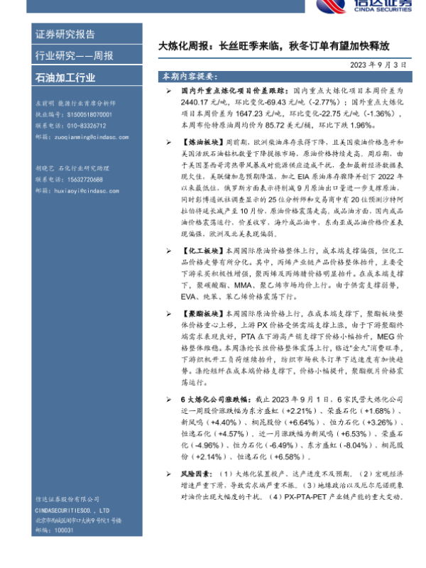 【信达证券】【20230903】大炼化周报:长丝旺季来临,秋冬订单有望加快释放-18页