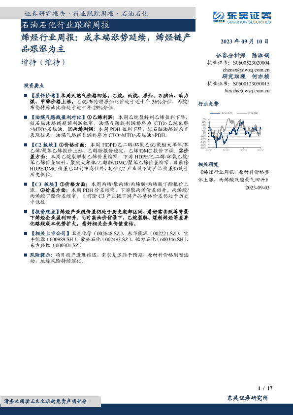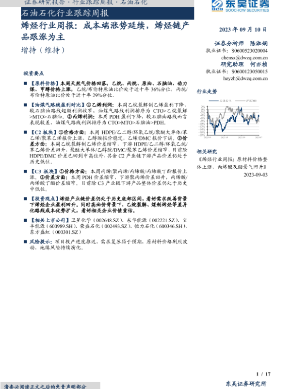 【东吴证券】【20230910】20230910-东吴证券-烯烃行业周报:成本端涨势延续,烯烃链产品跟涨为主-17页