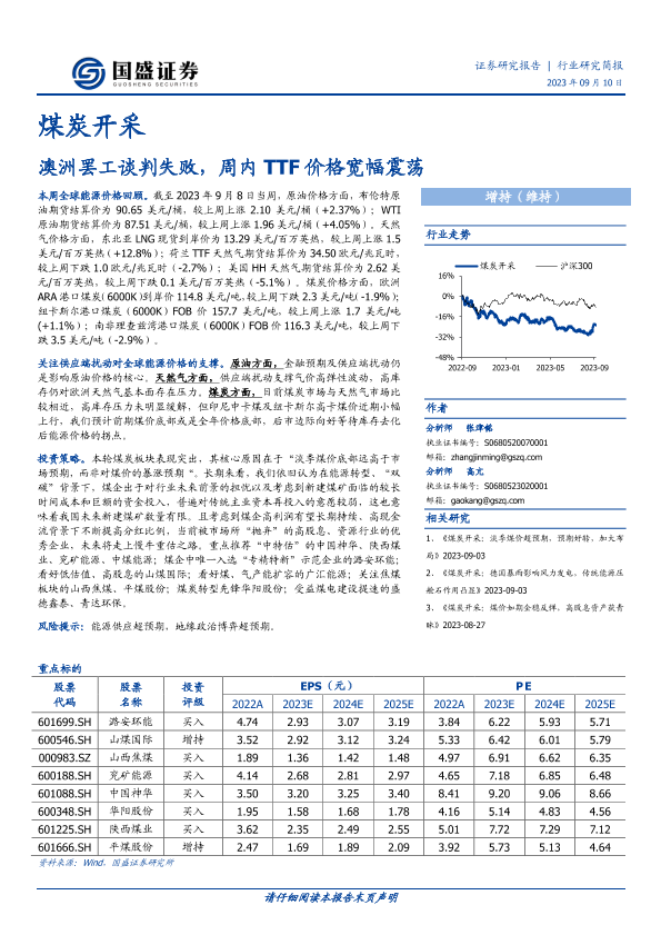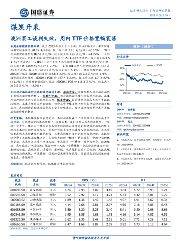 【国盛证券】【20230910】20230910-国盛证券-煤炭开采行业研究简报:澳洲罢工谈判失败,周内TTF价格宽幅震荡-14页