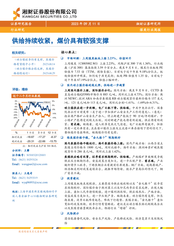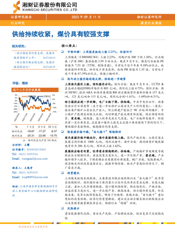 【湘财证券】【20230911】20230911-湘财证券-煤炭行业周报:供给持续收紧,煤价具有较强支撑-15页