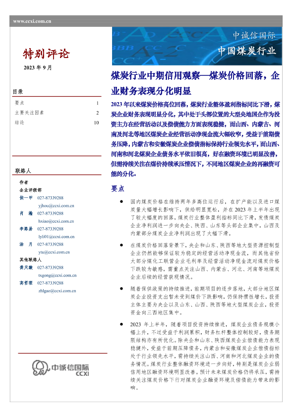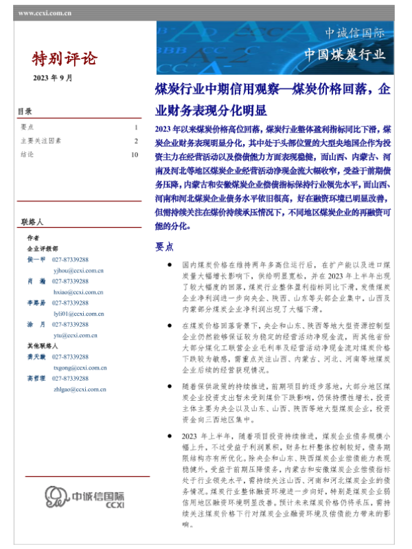 【中诚信国际】【20230914】中国煤炭行业:煤炭行业中期信用观察—煤炭价格回落,企业财务表现分化明显-12页