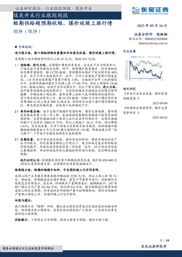 【东吴证券】【20230916】煤炭开采行业跟踪周报:短期供给超预期收缩,煤价延续上涨行情-10页