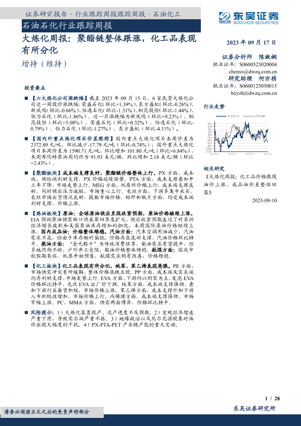 【东吴证券】【20230917】20230917-东吴证券-大炼化周报:聚酯链整体跟涨,化工品表现有所分化-28页
