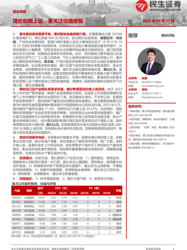 【民生证券】【20230917】20230917-民生证券-煤炭周报:煤价如期上涨,更关注估值修复-22页