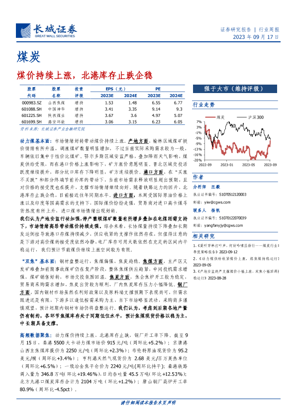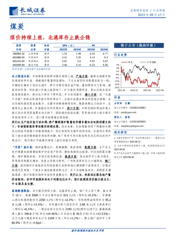 【长城证券】【20230917】20230917-长城证券-煤炭行业周报:煤价持续上涨,北港库存止跌企稳-19页
