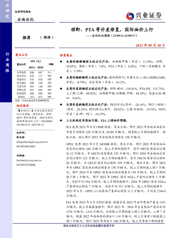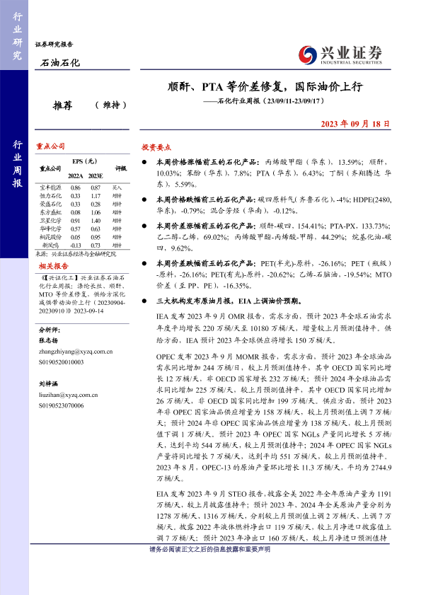 【兴业证券】【20230918】顺酐、PTA等价差修复,国际油价上行——石化行业周报(23/09/11-23/09/17)-17页