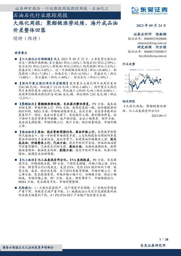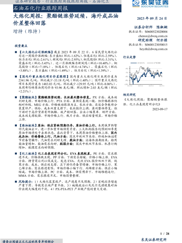 【东吴证券】【20230924】大炼化周报:聚酯链涨势延续,海外成品油价差整体回落-28页