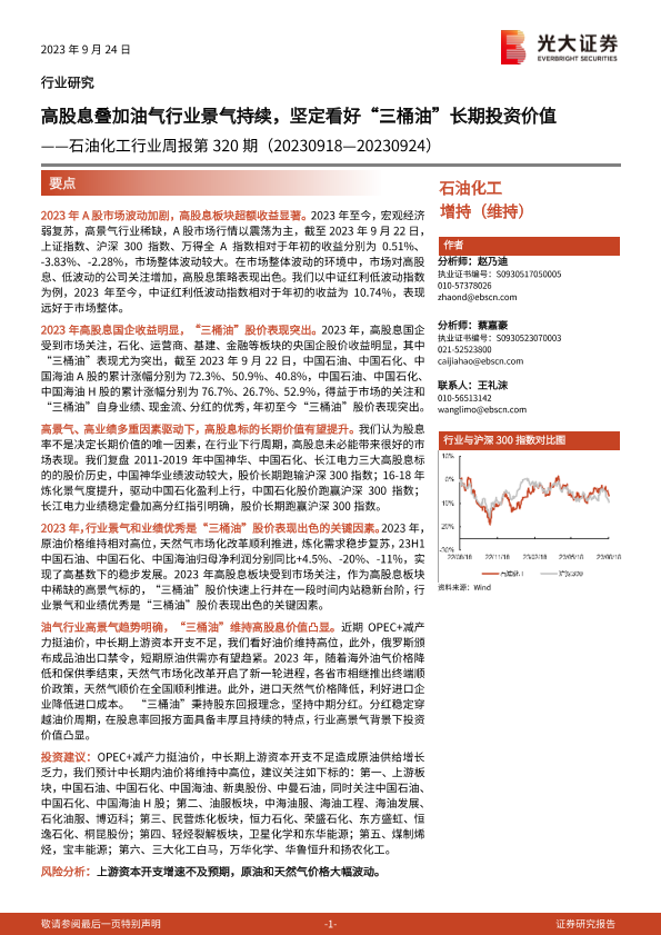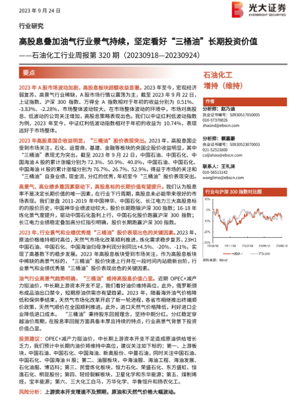 【光大证券】【20230924】20230924-光大证券-石油化工行业周报第320期:高股息叠加油气行业景气持续,坚定看好“三桶油”长期投资价值-25页