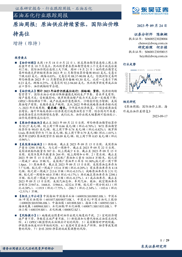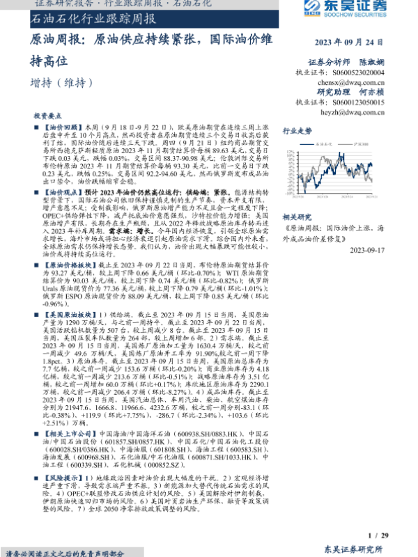 【东吴证券】【20230924】原油周报:原油供应持续紧张,国际油价维持高位-29页