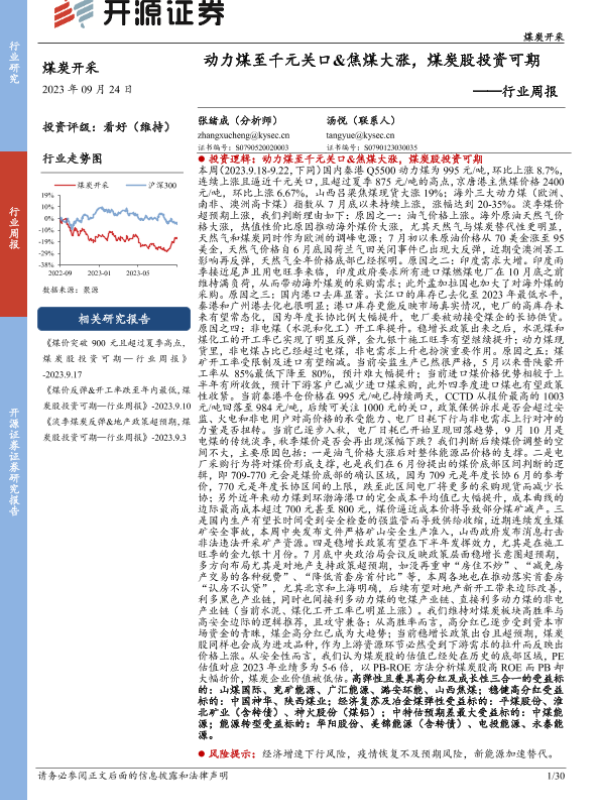 【开源证券】【20230924】20230924-开源证券-煤炭开采行业周报:动力煤至千元关口&焦煤大涨,煤炭股投资可期-30页