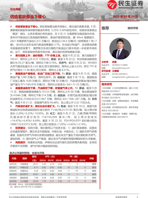 【民生证券】【20230924】20230924-民生证券-石化周报:供给紧缺是当下核心-29页