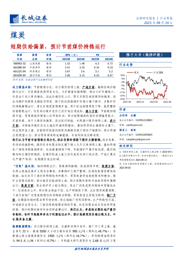 【长城证券】【20230924】20230924-长城证券-煤炭行业周报:短期供给偏紧,预计节前煤价持稳运行-18页