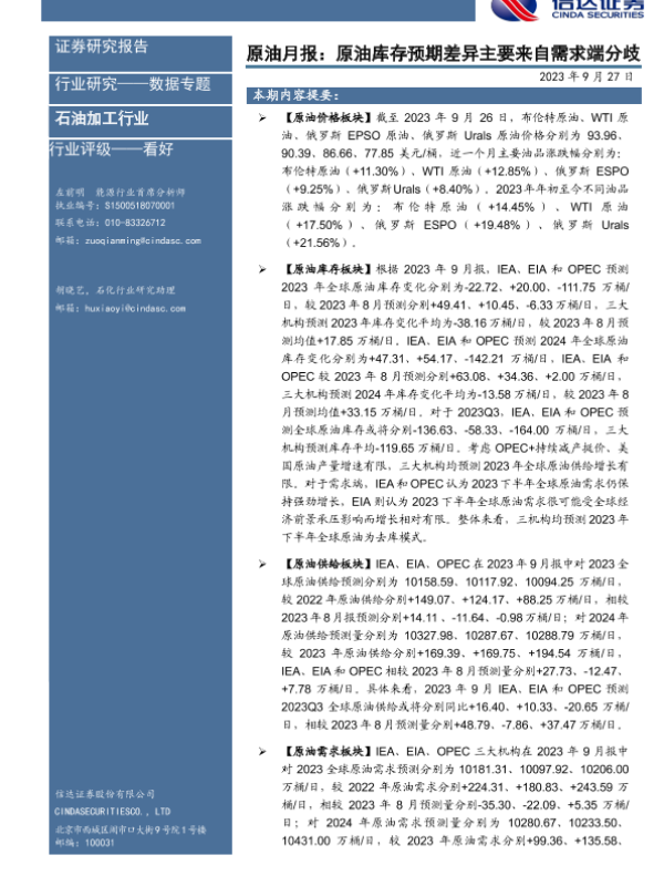 【信达证券】【20230927】原油月报:原油库存预期差异主要来自需求端分歧-25页