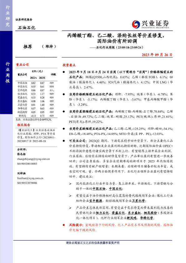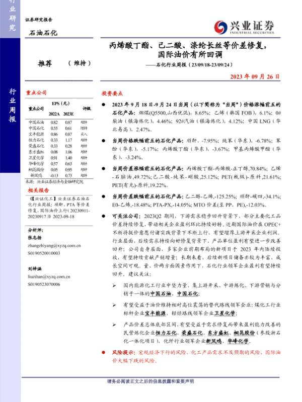 【兴业证券】【20230926】烯酸丁酯、己二酸、涤纶长丝等价差修复,国际油价有所回调——石化行业周报(23/09/18-23/09/24)-18页