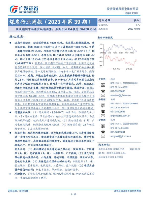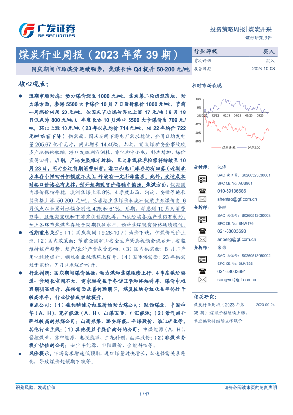 【广发证券】【20231008】煤炭行业周报(2023年第39期):国庆期间市场煤价延续强势,焦煤长协Q4提升50-200元/吨-17页