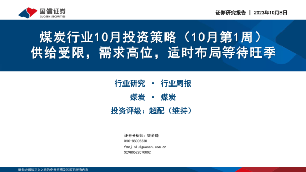 【国信证券】【20231008】煤炭行业10月投资策略(10月第1周):供给受限,需求高位,适时布局等待旺季-38页