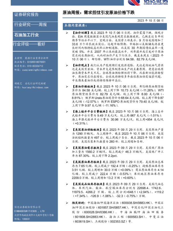【信达证券】【20231008】原油周报:需求担忧引发原油价格下跌-25页