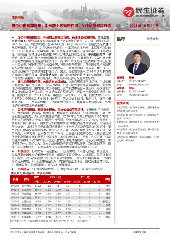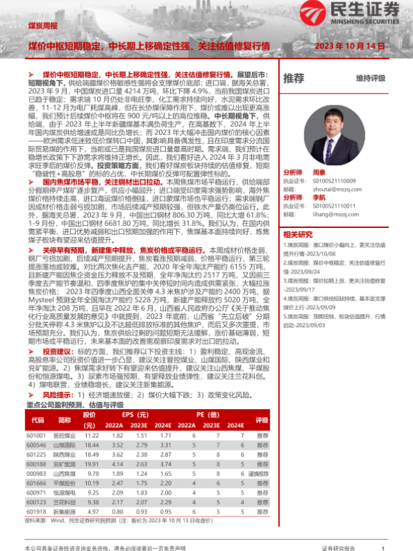 【民生证券】【20231014】煤炭周报:煤价中枢短期稳定,中长期上移确定性强,关注估值修复行情-23页