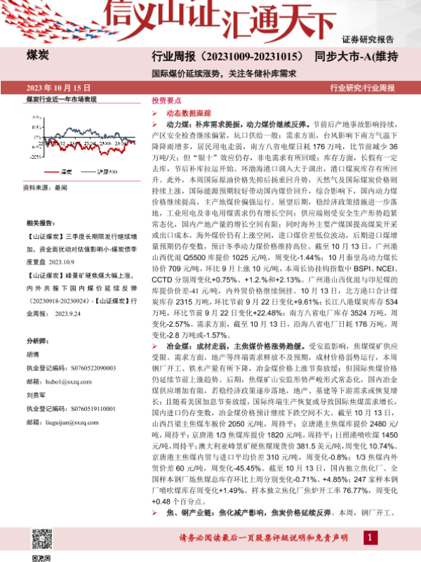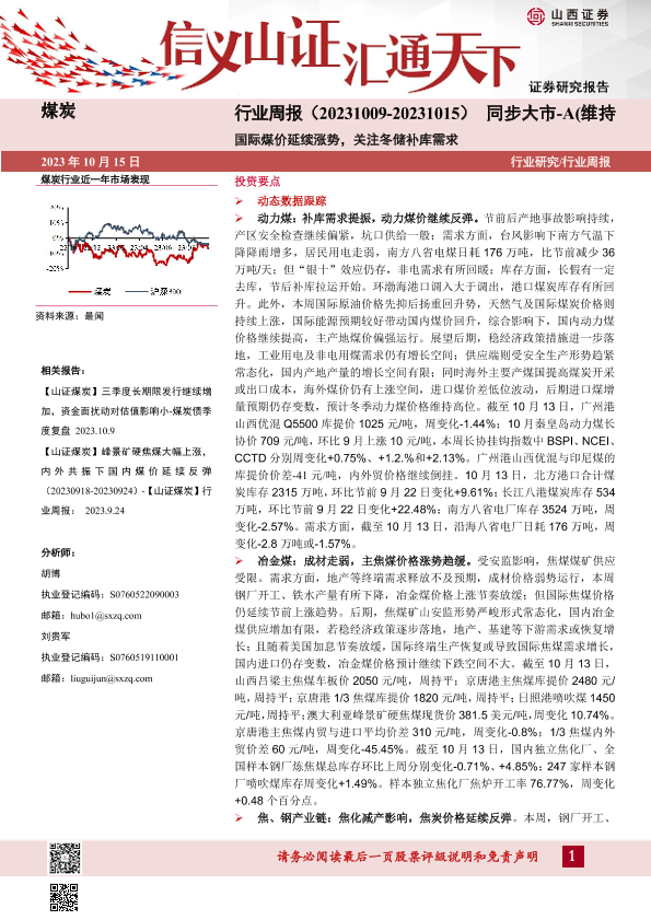 【山西证券】【20231015】煤炭行业周报:国际煤价延续涨势,关注冬储补库需求-19页