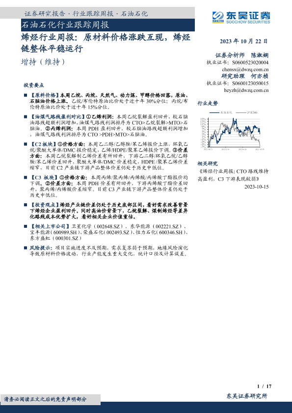 【东吴证券】【20231022】20231022-东吴证券-烯烃行业周报:原材料价格涨跌互现,烯烃链整体平稳运行-17页