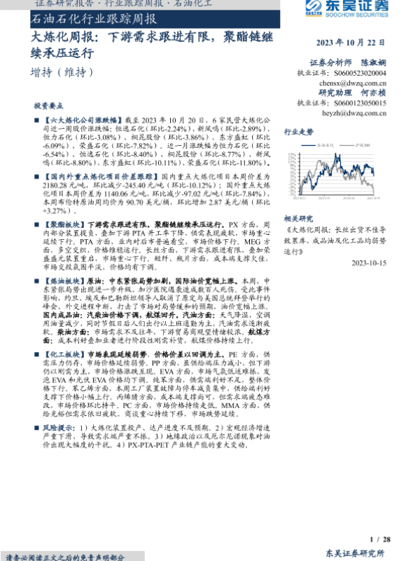 【东吴证券】【20231022】大炼化周报:下游需求跟进有限,聚酯链继续承压运行-28页