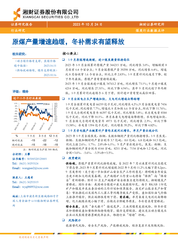 【湘财证券】【20231024】20231024-湘财证券-煤炭行业数据点评:原煤产量增速趋缓,冬补需求有望释放-10页