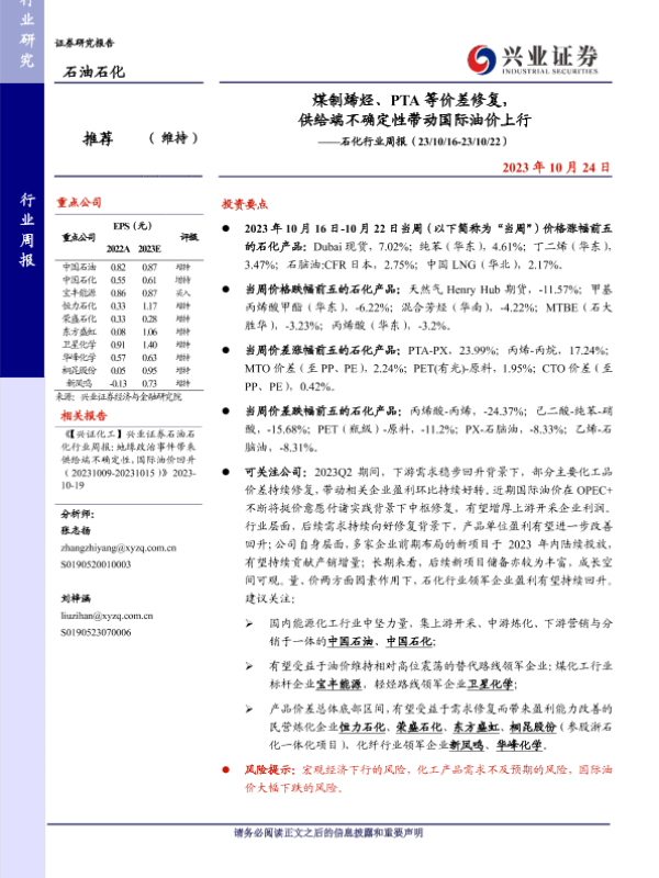 【兴业证券】【20231024】20231024-兴业证券-石化行业周报:煤制烯烃、PTA等价差修复,供给端不确定性带动国际油价上行-18页