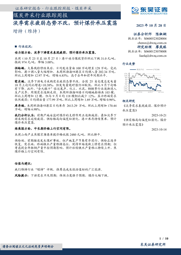 【东吴证券】【20231028】20231028-东吴证券-煤炭开采行业跟踪周报:淡季需求疲弱态势不改,预计煤价承压震荡-10页