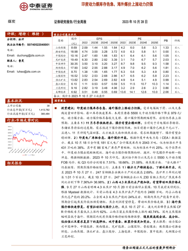 【中泰证券】【20231028】中泰证券-煤炭行业周报:印度动力煤库存告急,海外煤价上涨动力仍强-27页