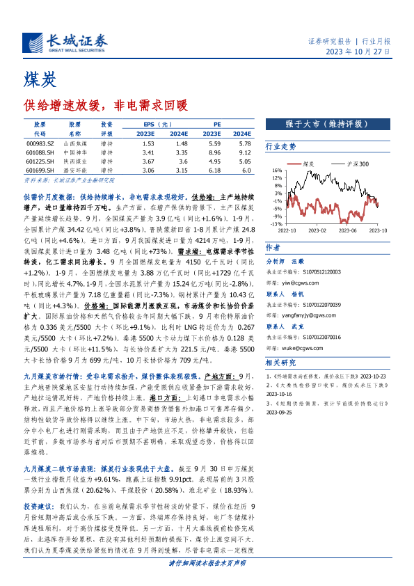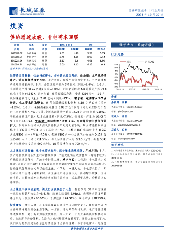 【长城证券】【20231027】20231027-长城证券-煤炭行业月报:供给增速放缓,非电需求回暖-18页