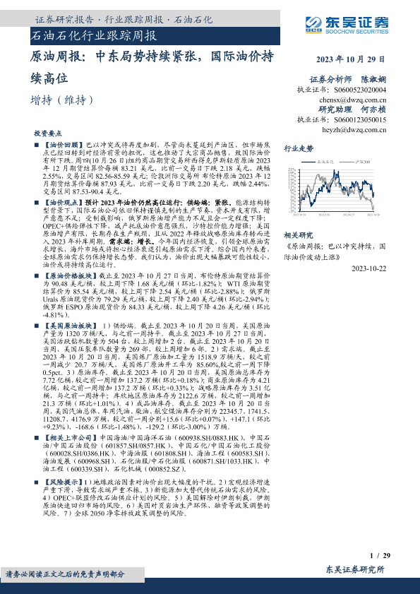 【东吴证券】【20231029】原油周报:中东局势持续紧张,国际油价持续高位-29页