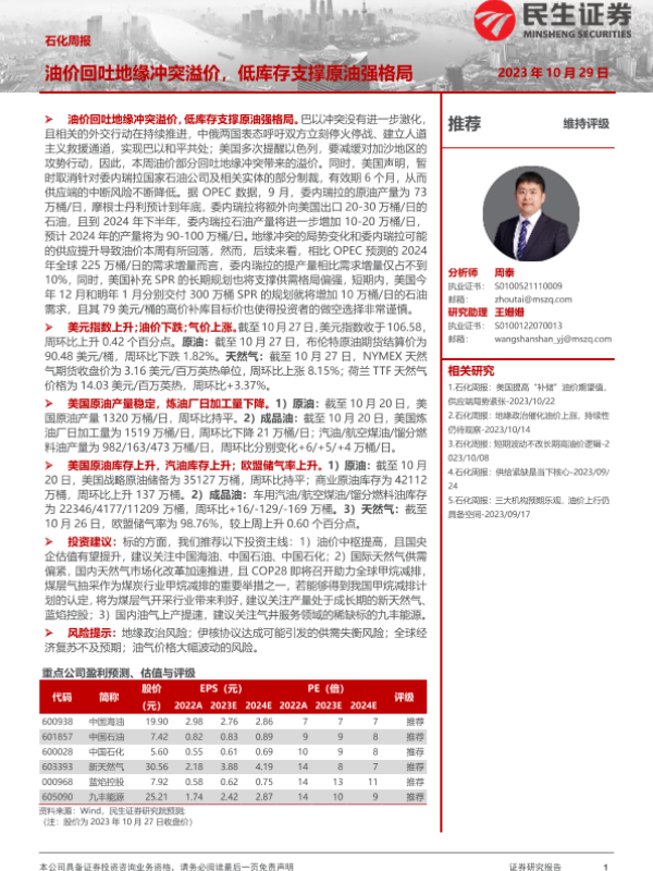【民生证券】【20231029】20231029-民生证券-石化周报:油价回吐地缘冲突溢价,低库存支撑原油强格局-30页