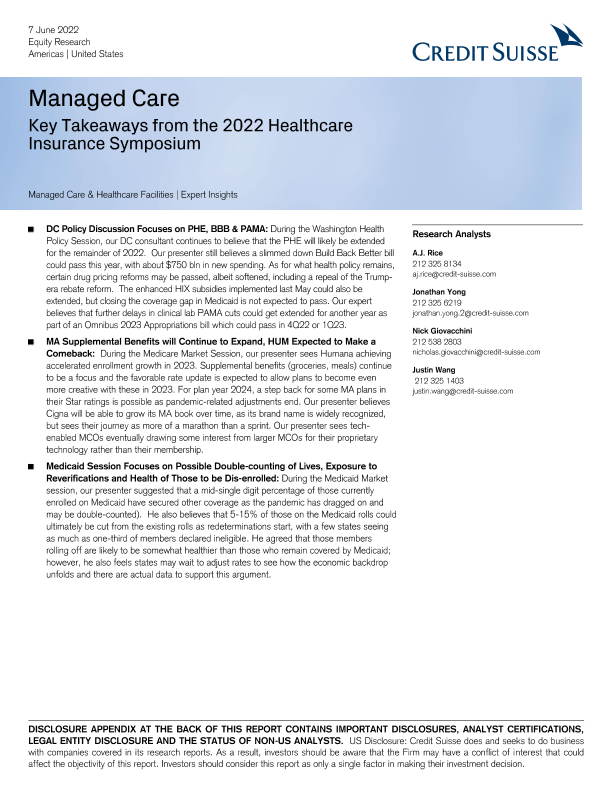 【瑞信】【20220607】瑞信-美股医疗保险行业-管理型医疗:2022年医疗保险研讨会的主要收获-40页