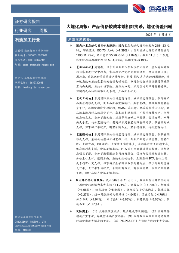 【信达证券】【20231105】大炼化周报:产品价格较成本端相对抗跌,炼化价差回暖-18页