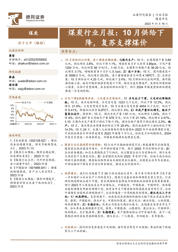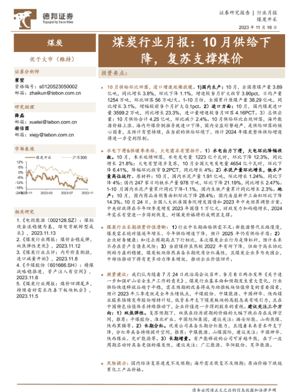 【德邦证券】【20231116】20231116-德邦证券-煤炭行业月报:10月供给下降,复苏支撑煤价-11页