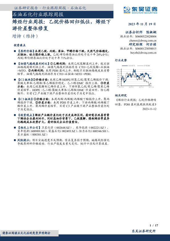 【东吴证券】【20231119】石油石化行业跟踪周报:烯烃行业周报:乙烷价格回归低位,烯烃下游价差整体修复-17页