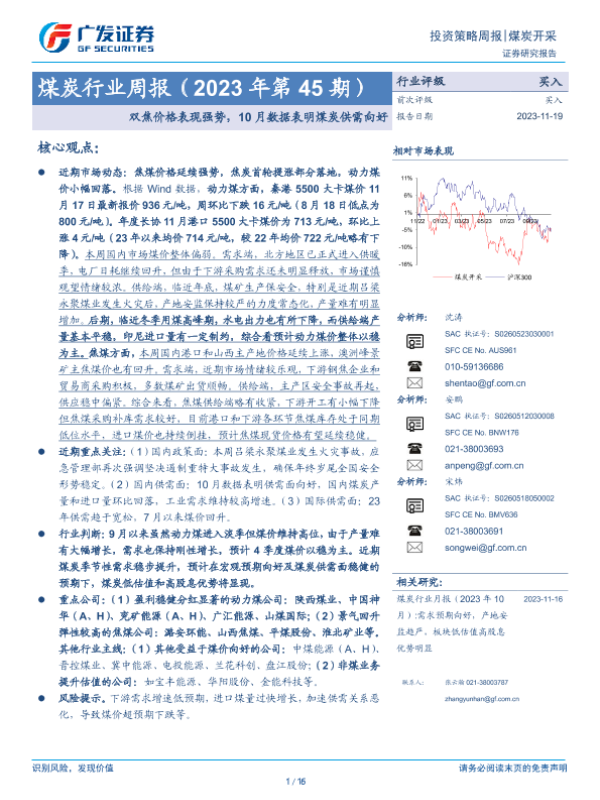 【广发证券】【20231119】20231119-广发证券-煤炭行业周报(2023年第45期):双焦价格表现强势,10月数据表明煤炭供需向好-16页