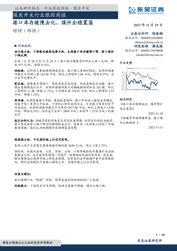 【东吴证券】【20231125】20231125-东吴证券-煤炭开采行业跟踪周报:港口库存缓慢去化,煤价企稳震荡-10页