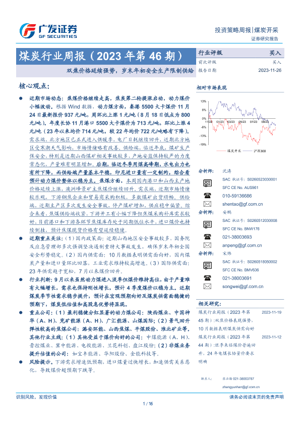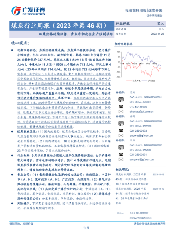【广发证券】【20231126】煤炭行业周报(2023年第46期):双焦价格延续强势,岁末年初安全生产限制供给-16页