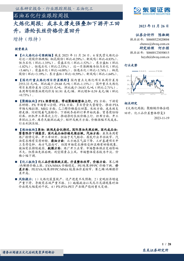 【东吴证券】【20231126】大炼化周报:成本支撑走强叠加下游开工回升,涤纶长丝价格价差回升-28页
