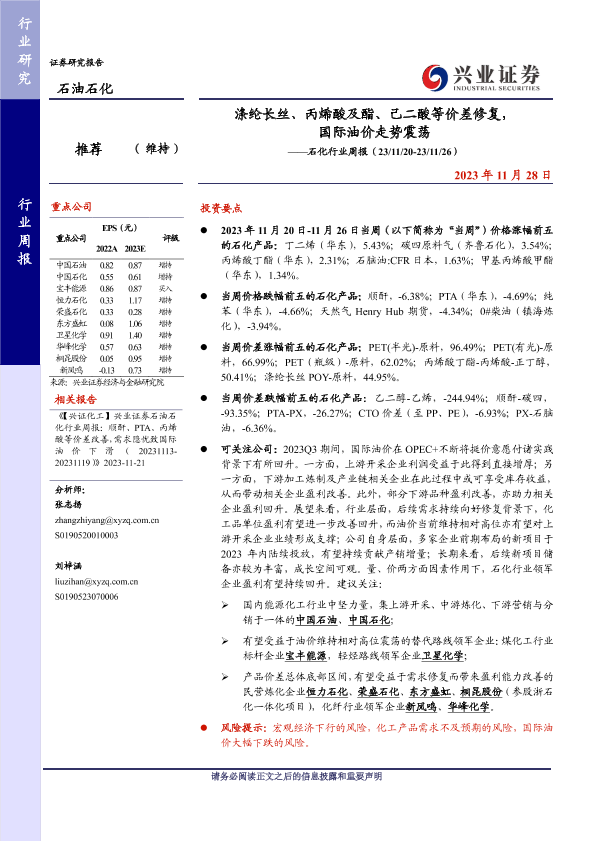 【兴业证券】【20231128】涤纶长丝、丙烯酸及酯、己二酸等价差修复,国际油价走势震荡——石化行业周报(23/11/20-23/11/26)-18页