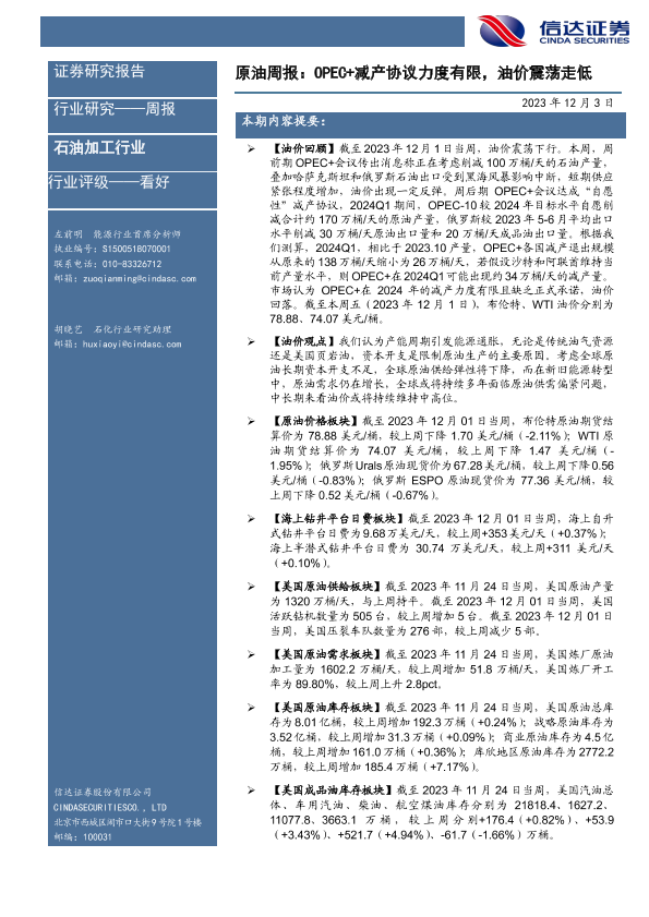 【信达证券】【20231203】原油周报:OPEC+减产协议力度有限,油价震荡走低-25页