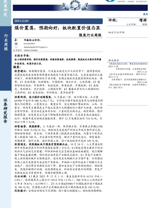 【国泰君安证券】【20231203】20231203-国泰君安-煤炭行业周报:煤价震荡,预期向好,板块配置价值凸显-22页