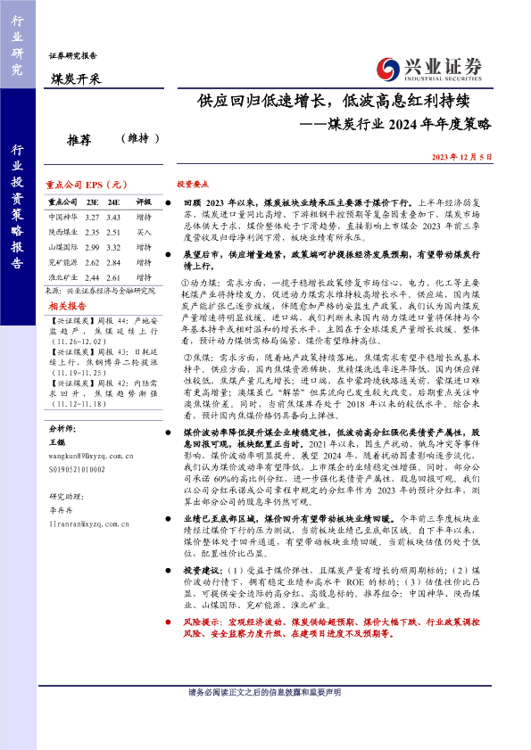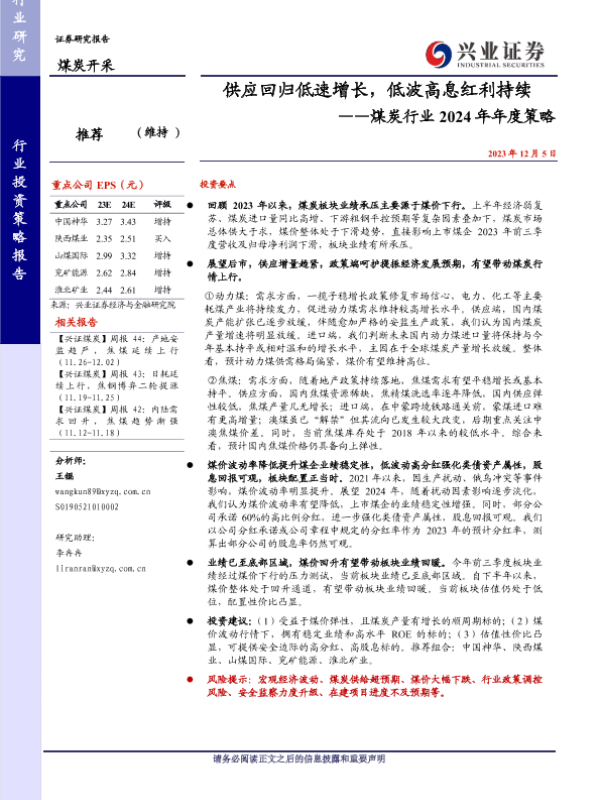 【兴业证券】【20231205】20231205-兴业证券-煤炭行业2024年年度策略:供应回归低速增长,低波高息红利持续-33页