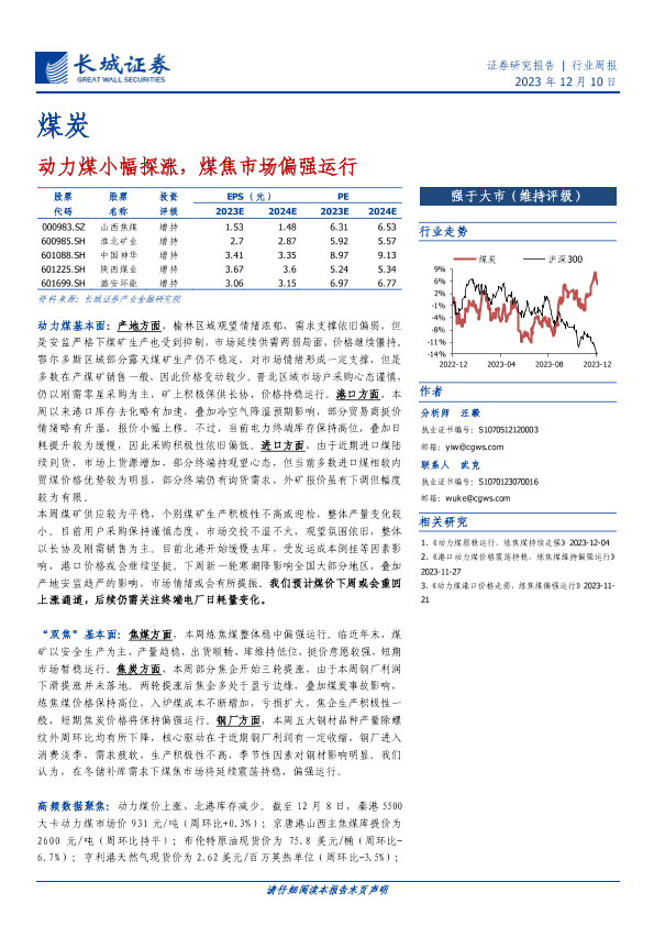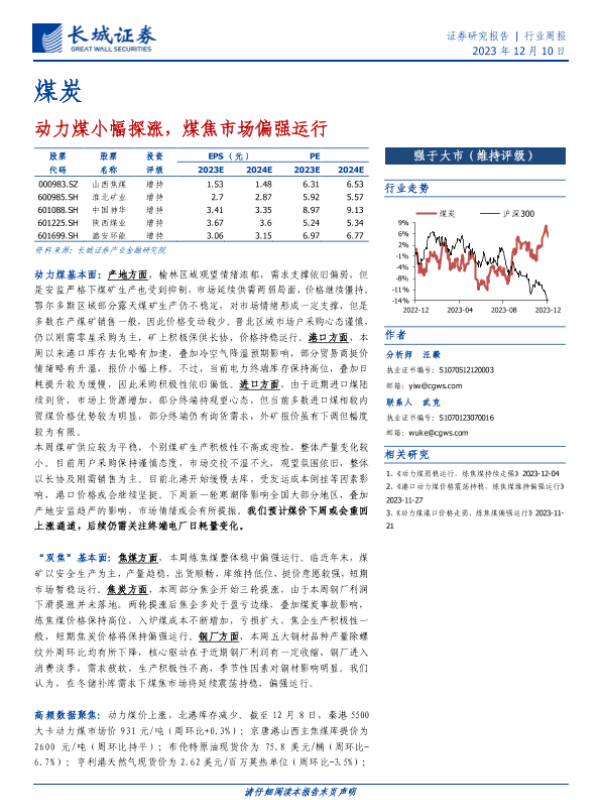 【长城证券】【20231210】20231210-长城证券-煤炭行业周报:动力煤小幅探涨,煤焦市场偏强运行-19页