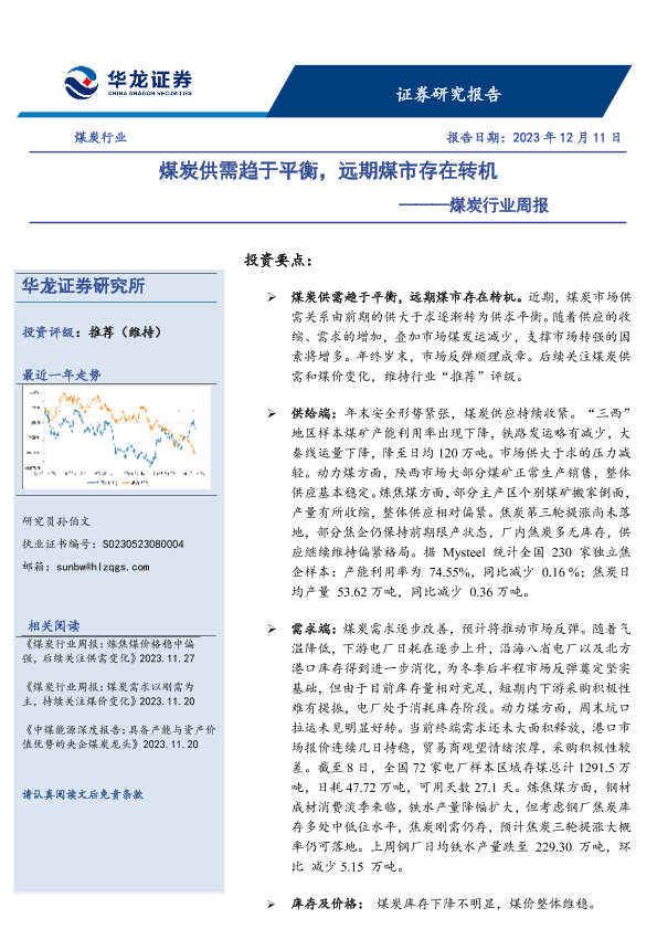 【华龙证券】【20231211】20231211-华龙证券-煤炭行业周报:煤炭供需趋于平衡,远期煤市存在转机-15页
