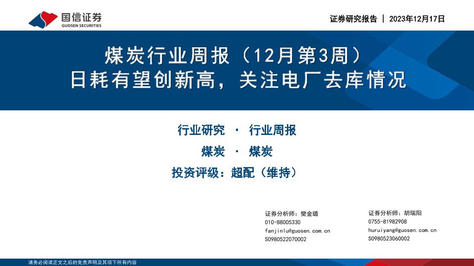 【国信证券】【20231217】20231217-国信证券-煤炭行业周报(12月第3周):日耗有望创新高,关注电厂去库情况-30页